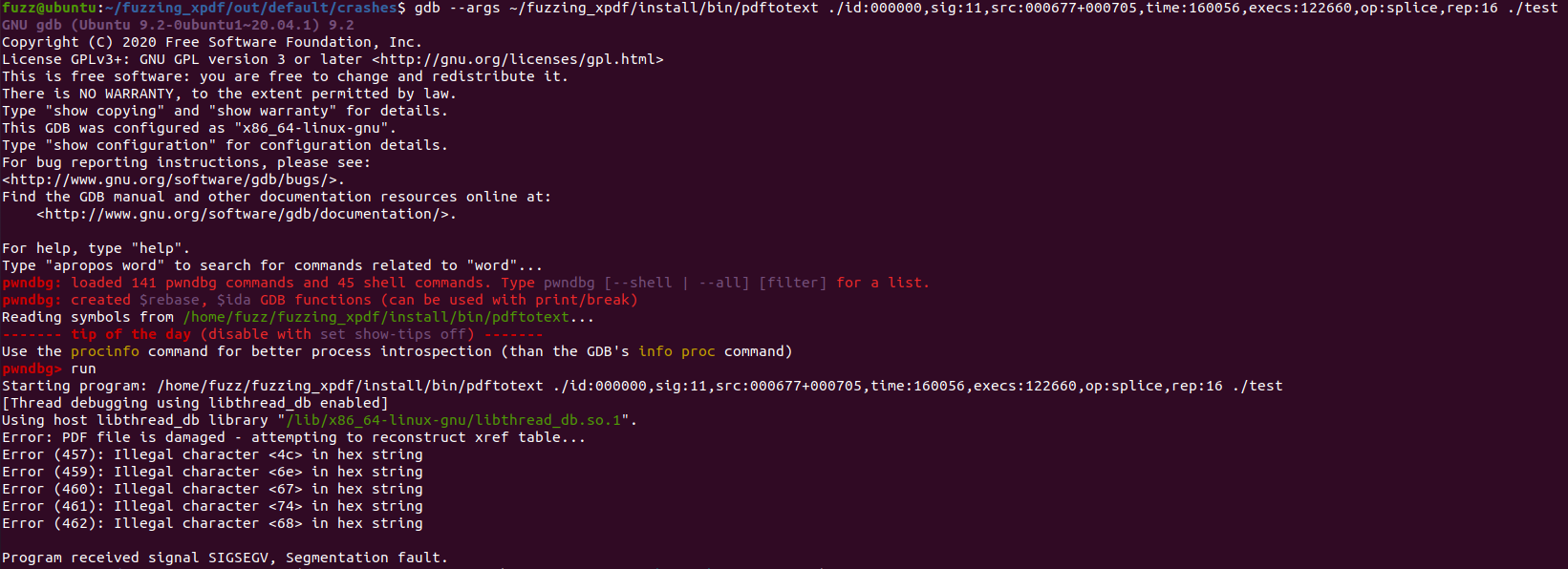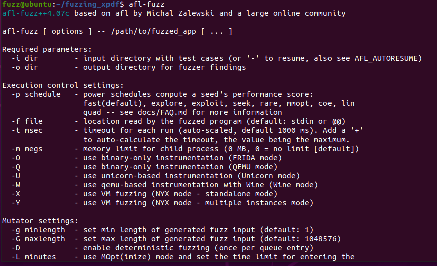 afl-fuzz -i $HOME/fuzzing_xpdf/pdf_examples/ -o $HOME/fuzzing_xpdf/out/ -s 123 -- $HOME/fuzzing_xpdf/install/bin/pdftotext @@ $HOME/fuzzing_xpdf/output