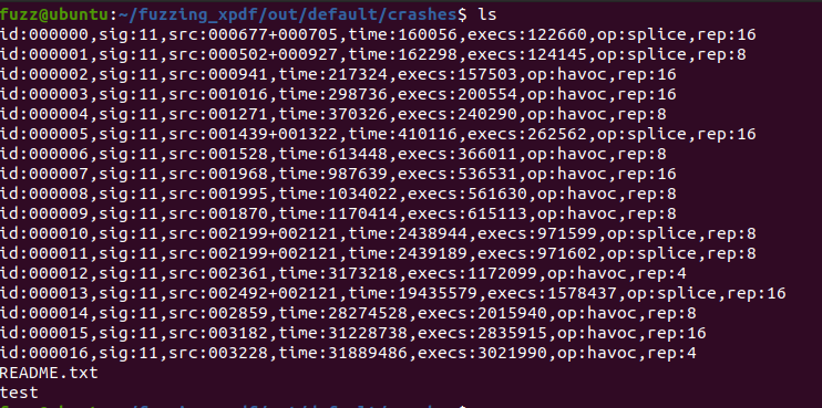 자, 어느정도 퍼저를 돌리다가 중단하고 /crashes 디렉토리에 들어가보면 여러 크랙된 파일을 볼 수 있다.