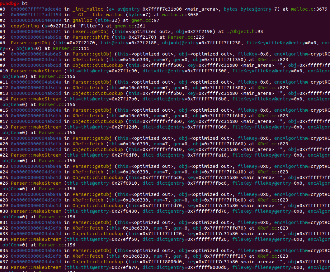 코드를 보면 Parser,XRef, Object 이 3개가 무한으로 도는 모습 그러니까 무한 재귀에 걸려 빠져나오지 못하고 있다.